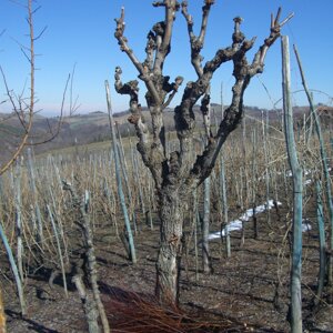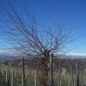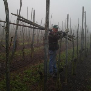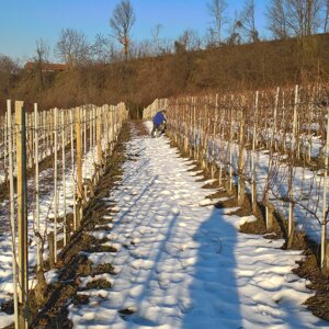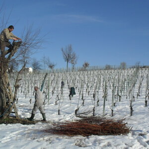 Durante il periodo che va da Dicembre a metà Febbraio le vigne vengono POTATE . Il sistema che utilizziamo noi è quello chiamato Guyot Semplice, ossia il metodo di potatura più utilizzato nel mondo per un tipo di viticoltura votata alla qualità. Si lascia un piccolo sperone ( che darà i tralci per l'anno successivo) ed un capo a frutto. I rami della passata stagione detti sermenti vengono buttati per terra e sminuzzati in modo che formeranno della sostanza organica.Finita la fase della potatura i nuovi capo a frutto devono essere legati al sostegno. Si inizia quindi controllando i pali e si sostituiscono quelli usurati. Si tagliano quindi dalle piante dei salici i vimini necessari alla legatura , si modano e finita questa operazione si può iniziare la legatura, che di solito dura da metà/fine febbraio fino a fine marzo.