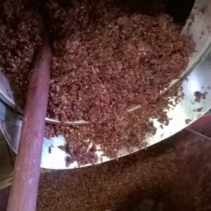 Durante questa fase non aggiungiamo solfiti od altri prodotti, per cercare di favorire il più possibile lo sviluppo dei lieviti indigeni che si trovano naturalmente sopra le bucce. Le vasche subiscono numerosi rimontaggi giornalieri dei quali 2 all’aria utilizzando un recipiente per incorporare al mosto l’ossigeno necessario alla vita dei lieviti.